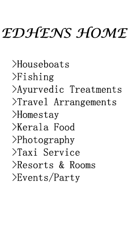 Edhens home is one of the best places in Alappuzha which provide the warmth of welcoming for everyone who wants to explore Alappuzha. Our services mainly include resorts, home stay, houseboat booking and rental service. We also offer Ayurvedic treatments to nourish and enrich your soul and body. We here in Edhens Home provide our guests with authentic Kerala food on demand.